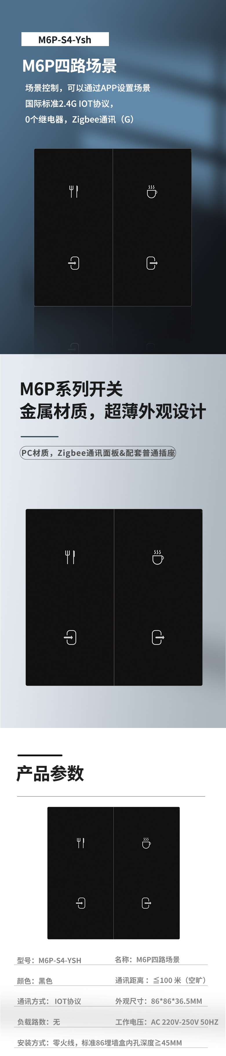 M6P四路开关 PC款,4个继电器,Zigbee通讯 G 金色 M6P-K4-Yg