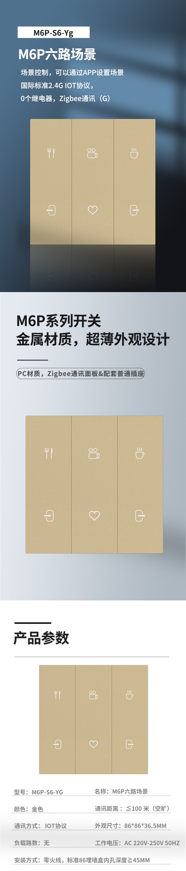 M6P二路开关 PC款,2个继电器,Zigbee通讯 G 金色 M6P-K2-Yg