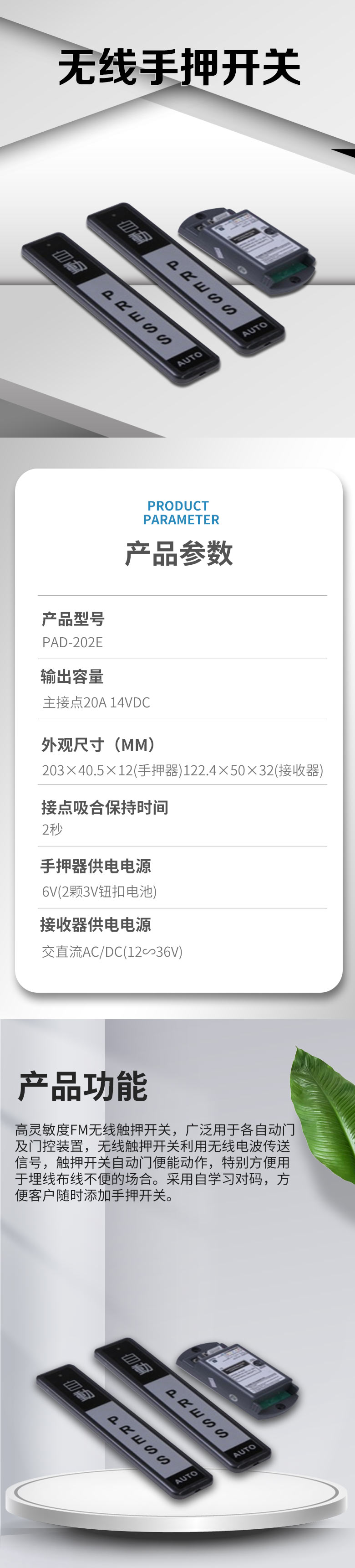 无线手押开关 发射器150×40×12.5mm/接收器110×30×15mm 发射距离30m PAD-202G