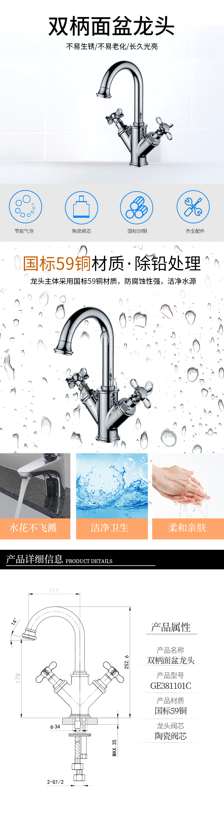 斯飞奥双柄面盆龙头 国标59铜 铬色 1/2铜阀芯 进口起泡器 三孔安装 配G1/2冷热进水管 F5781GE
