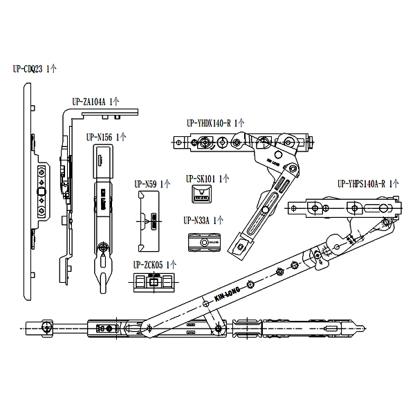 90°内开内倒套装右式(90KG,下料可调,窗宽500-800,中心距13,不含执手) UP-ND063-R