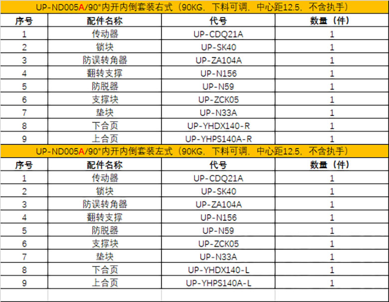 90°内开内倒套装(70KG 下料可调 合页不可调 中心距12.5 不含执手)
