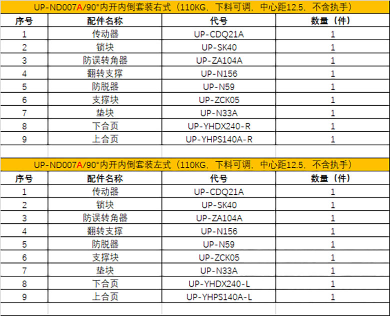 90°隐藏式内开内倒套装(70kg 不含传动器 不可调节)